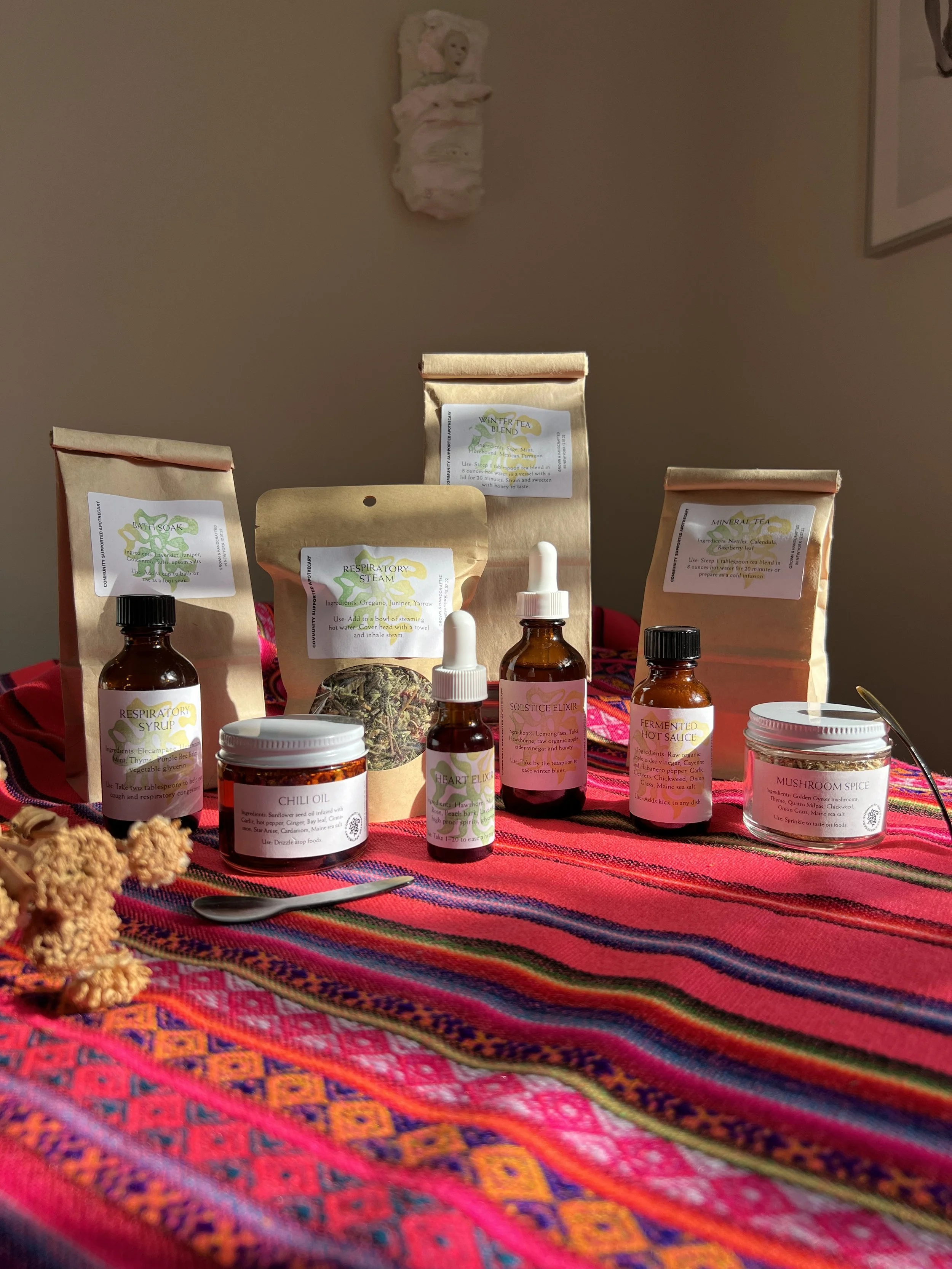With each share of Olamina Botanicals’ 2024-2025 Community Supported Apothecary, you’ll receive a box of 5 herbal formulas made from herbs our founder Jess Turner grows and forages, alongside a zine she’s written to guide you through the plants peaking at each moment in the season, with suggested uses of each blend.